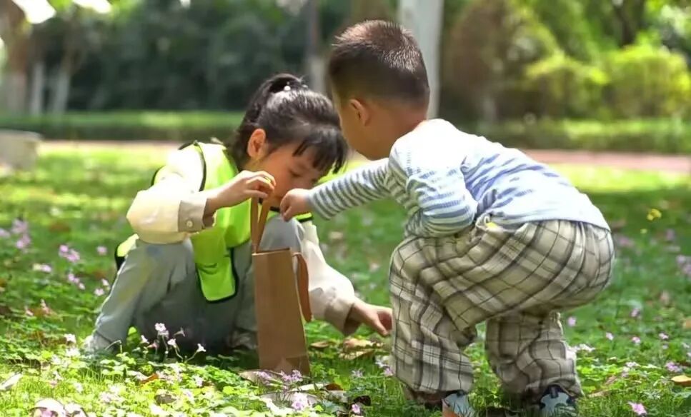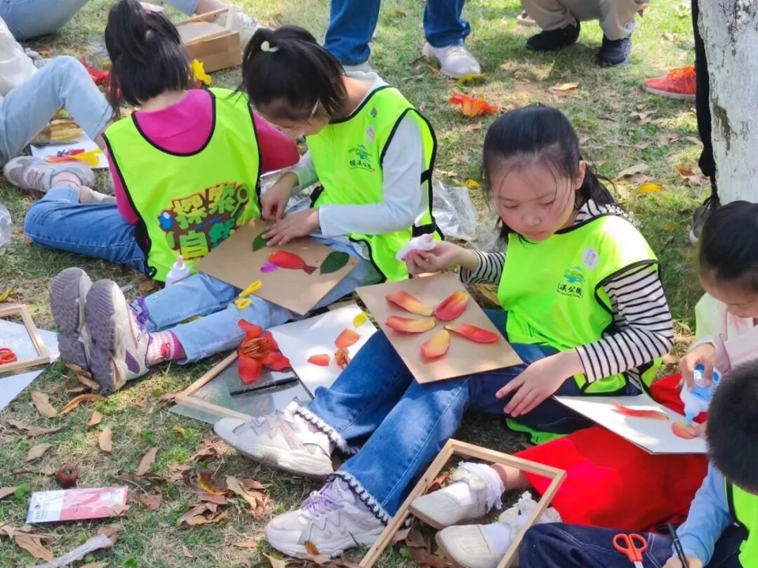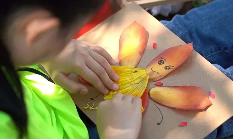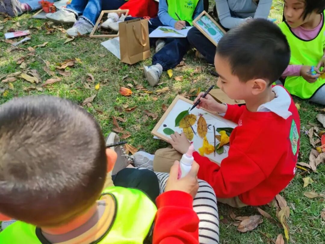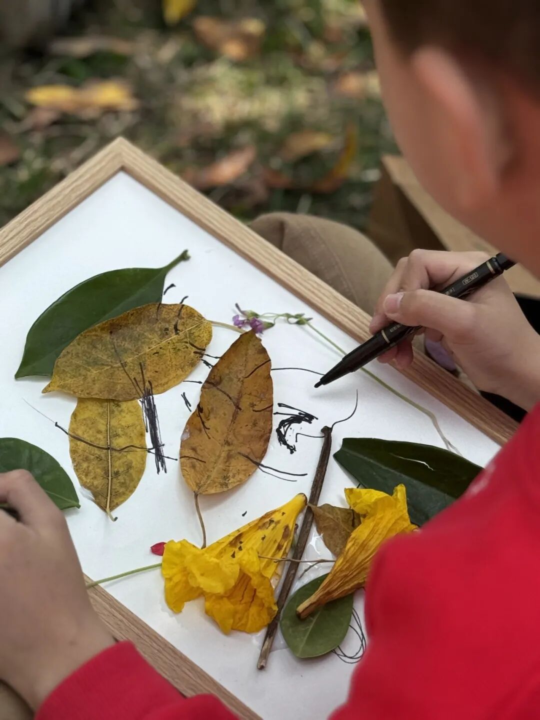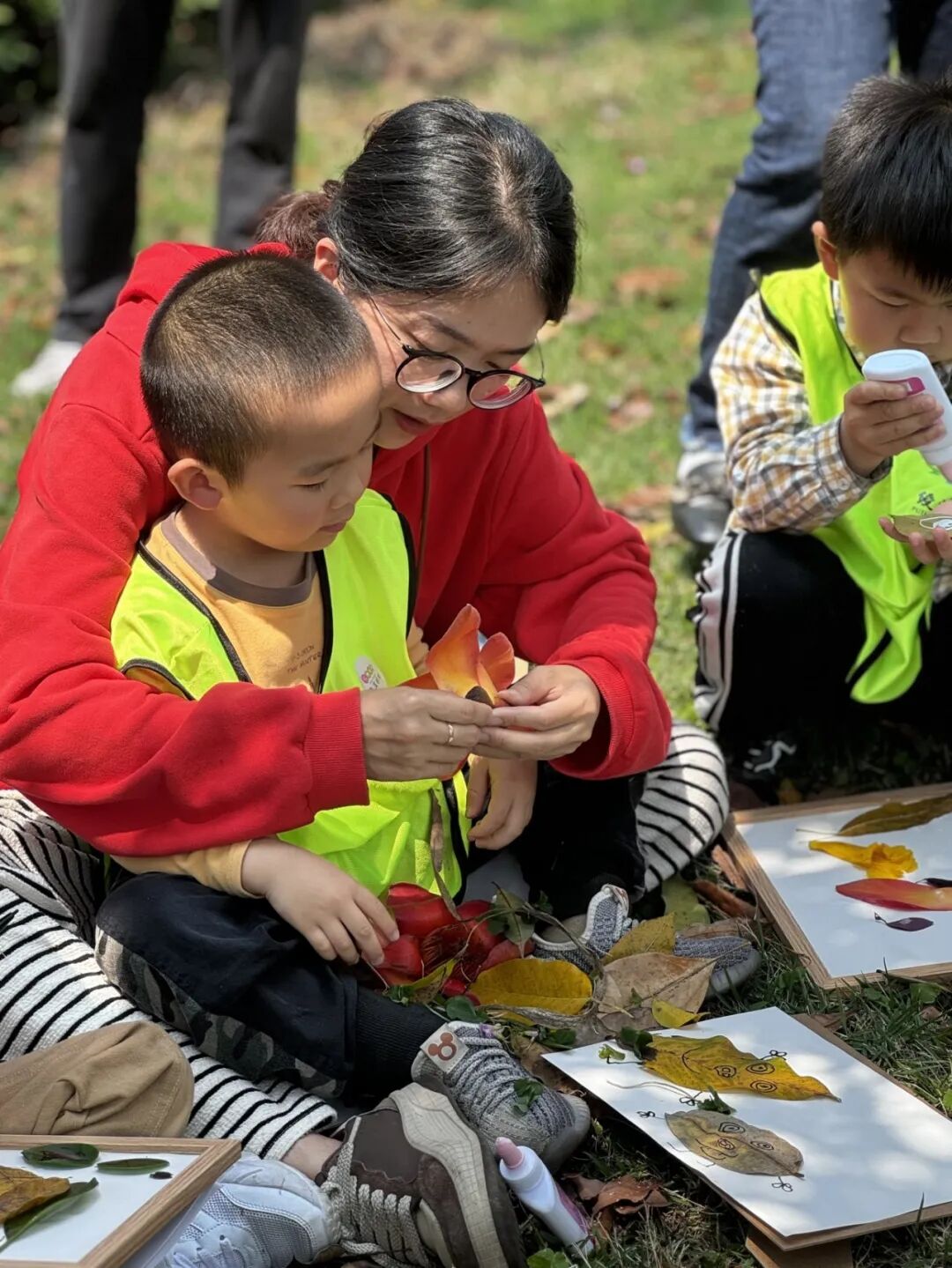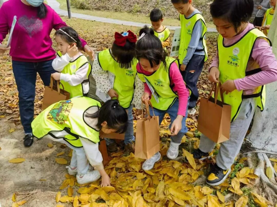 一路上,小朋友們邊玩邊學,沿路就地取材,精心挑選公園各種枯枝、落花、落葉等創(chuàng)作素材。