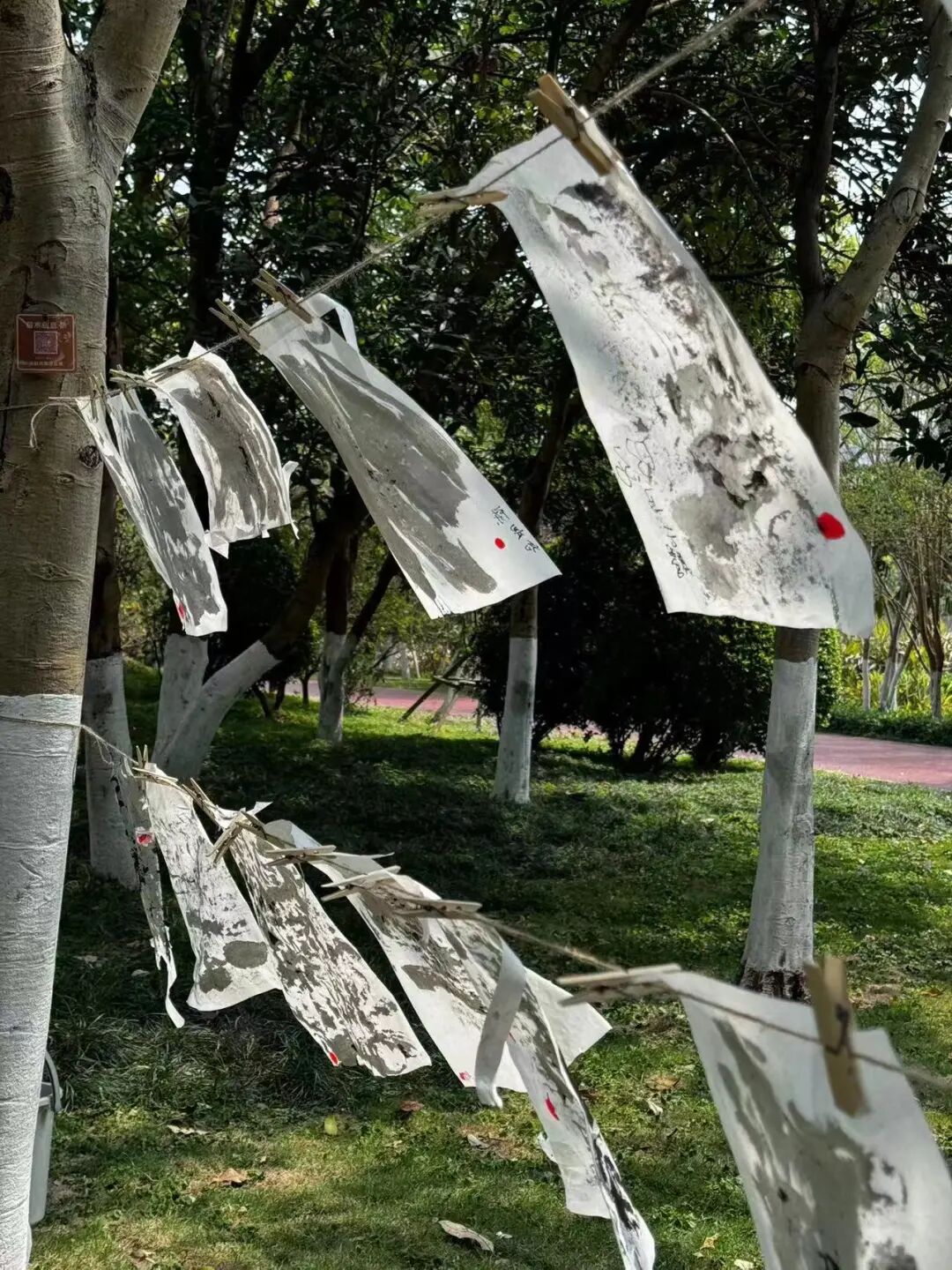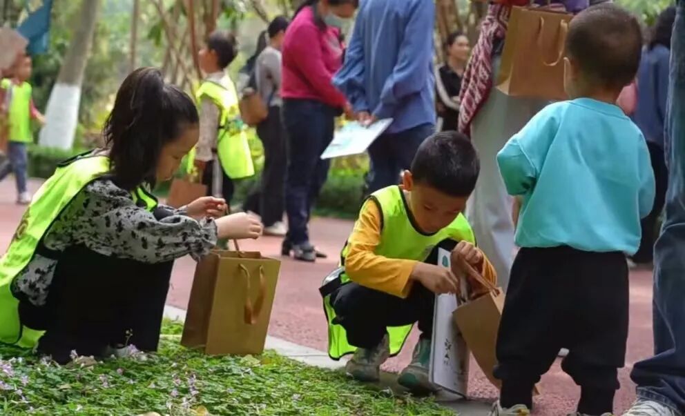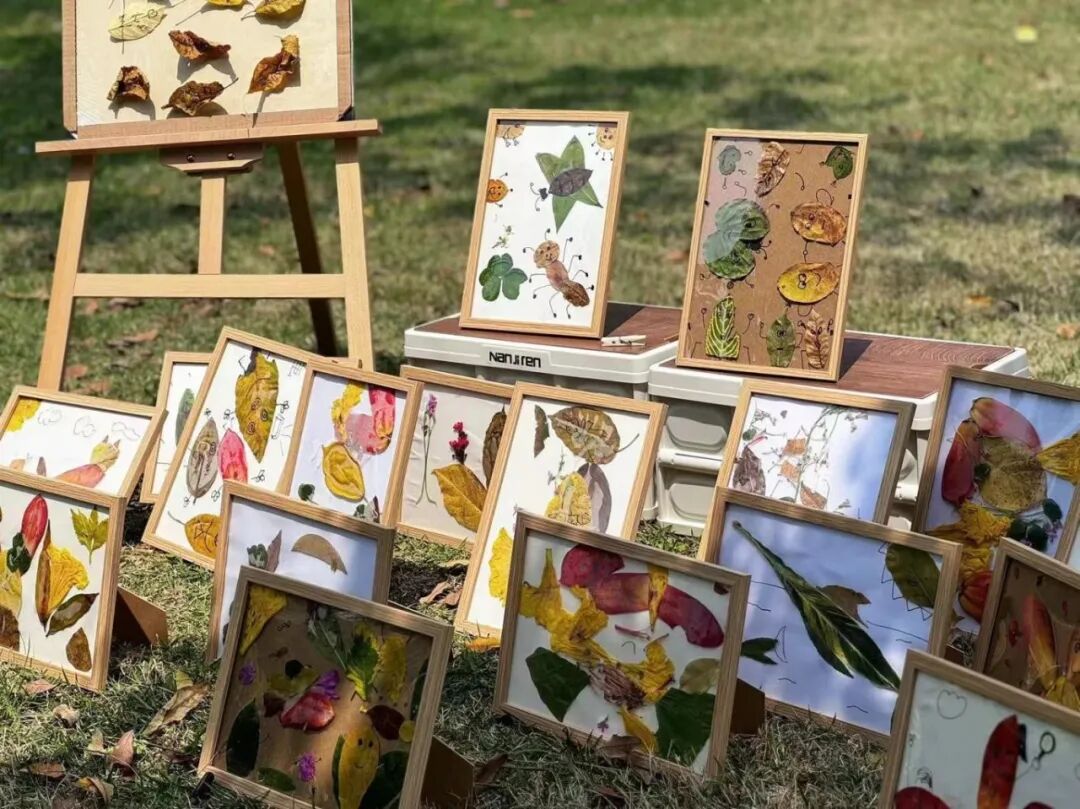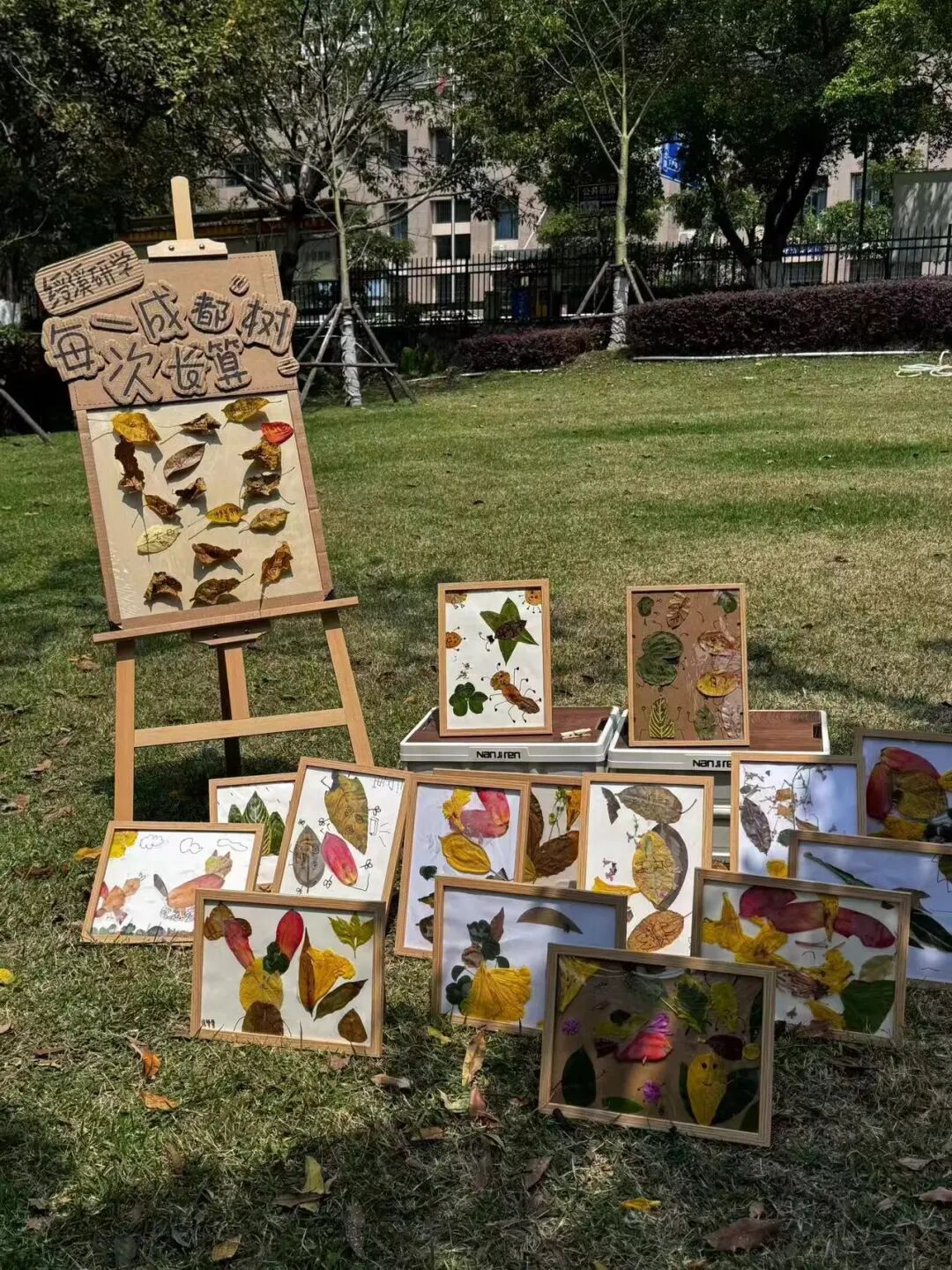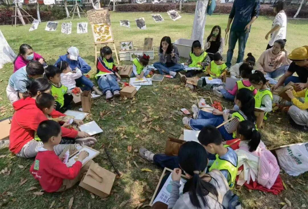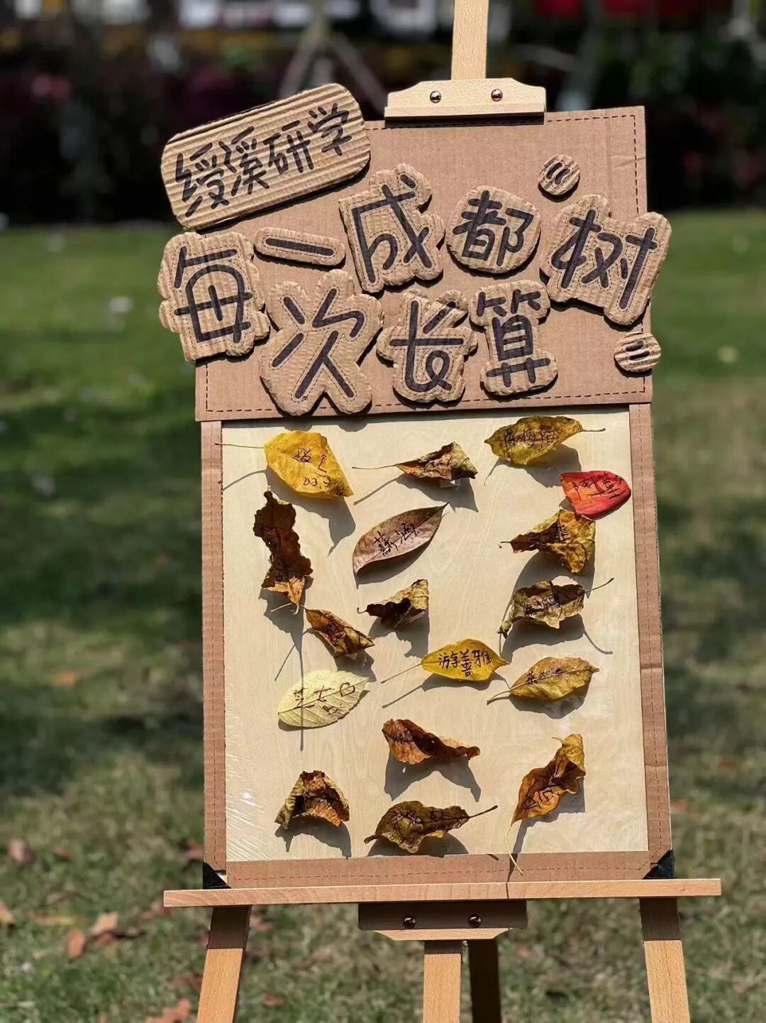 一路上,小朋友們邊玩邊學,沿路就地取材,精心挑選公園各種枯枝、落花、落葉等創(chuàng)作素材。