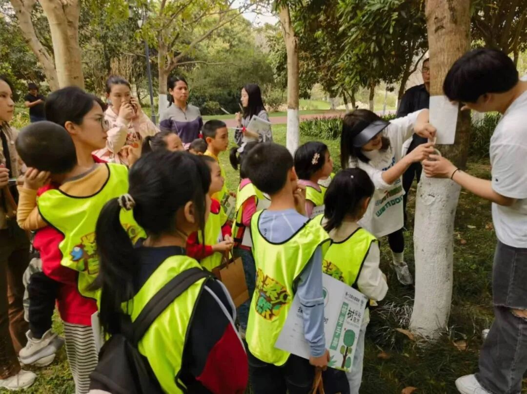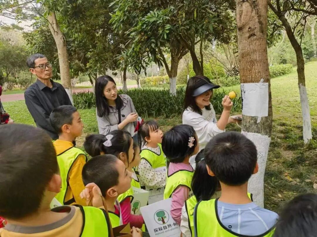 科普現場,研學老師老師悉心介紹大樹的組成結構,各部分功能以及生長過程,重點介紹了公園迎風綻放的黃花風鈴木及傲然挺立木棉樹。小朋友們認真聽講,踴躍發(fā)言,積極get√園林科普新知識。