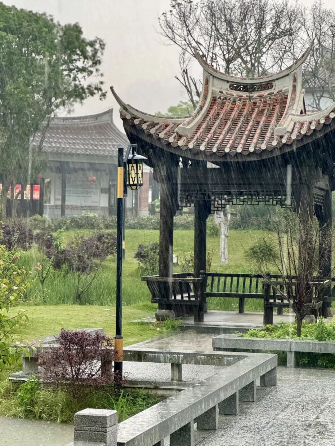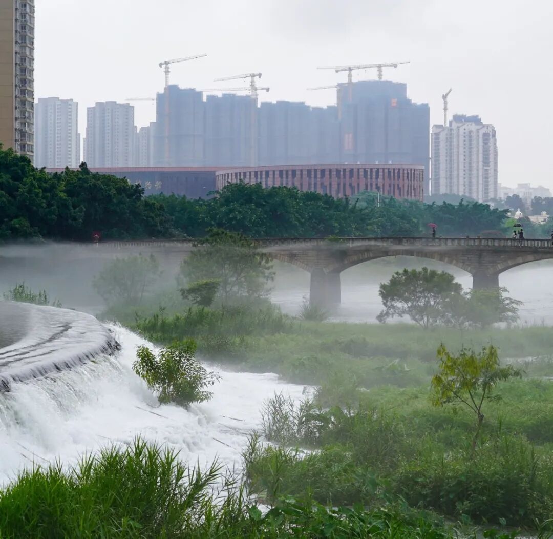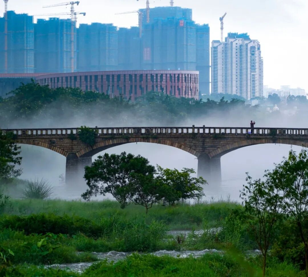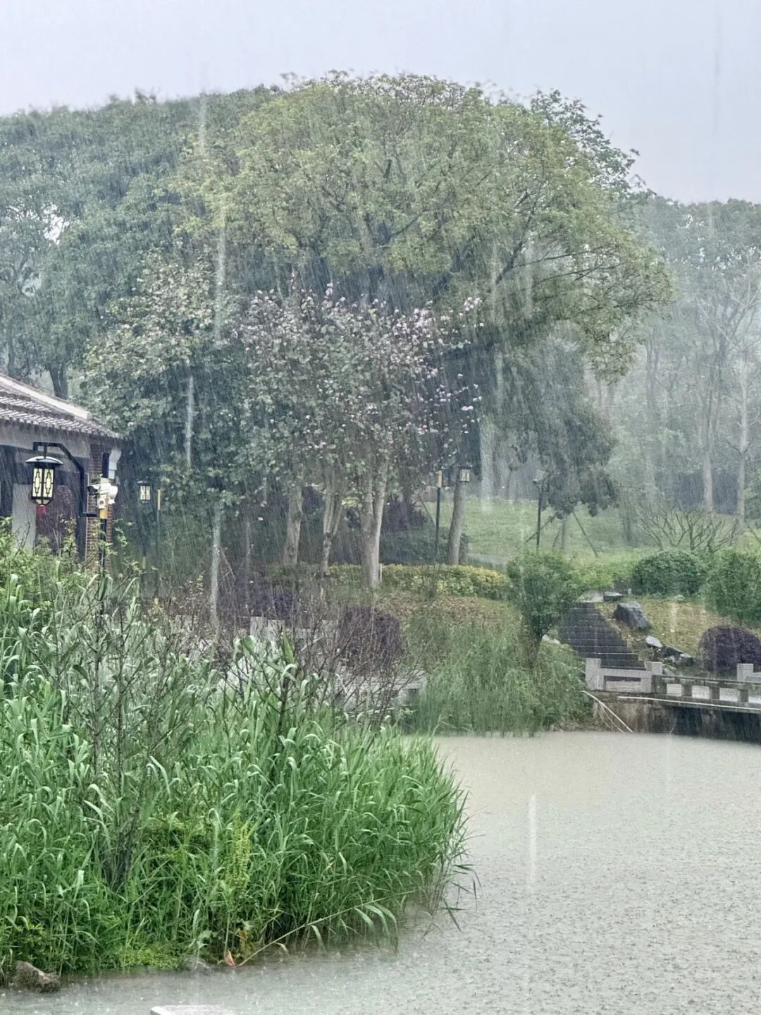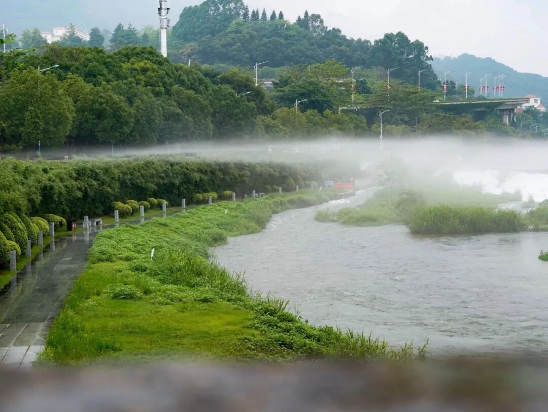 天地一片霧雨茫茫,綬溪溪水被雨水激起片片漣漪,所見之處一切都是模糊的,仿佛來到了古詩詞的煙雨意境之中。