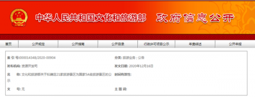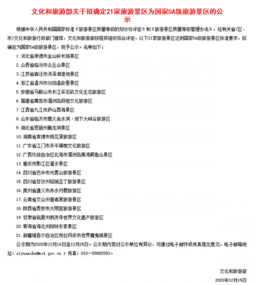文化和旅游部關于擬確定21家旅游景區(qū)為國家5A級旅游景區(qū)的公示